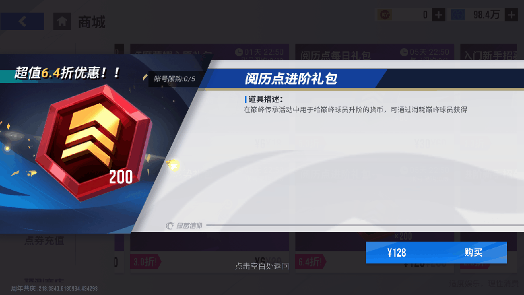 10月17日11时-10月24日11时期间,可在商场购买【阅历点进阶礼包】,账号限购5次,购买可获得阅历点*200,仅需128元!