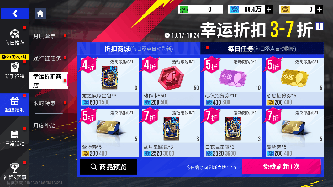 10月17日11时-10月24日11时期间,幸运折扣商店全新改版,刷新券可以同时刷新商品种类和折扣,最低可至3折,玩家可以通过完成任务获得刷新券,可购买【意大利巨星包】、【白衣巨星包】、【蓝月星耀包】、【利物浦红球星包】等奖励!