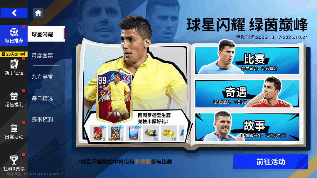 10月17日11时-10月24日11时期间,使用罗德里,回顾西班牙铁腰的传奇生涯,兑换丰厚好礼!更有99精选罗德里等着您!完成任务获得星光币,可在闪耀商城兑换「96+巅峰球员包」「蓝月群星包」「斗牛士军团球员包」「登场券」「心愿招募券」!