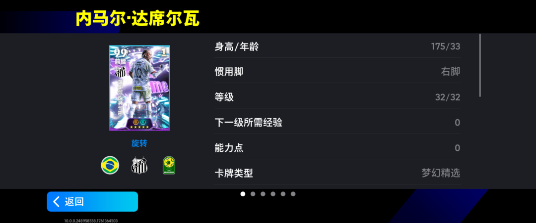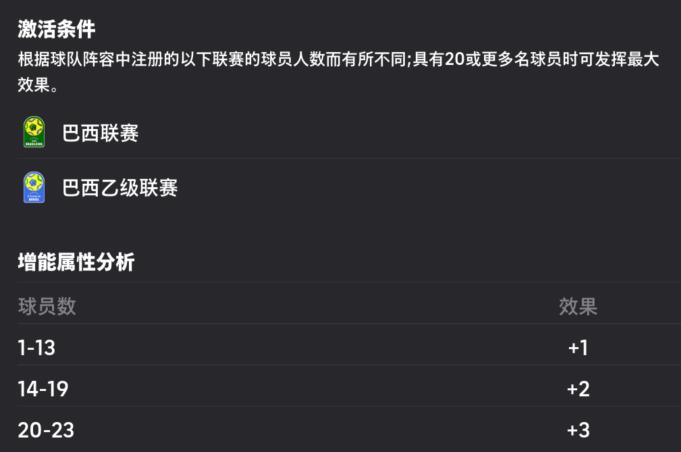 双增能梦幻精选内马尔拥有【全面提升】的增能加成,增能加成效果根据球队阵容中注册的巴西联赛和巴西乙级联赛的球员人数而有所不同,具有20或更多名球员时可发挥最大效果,最高能够拥有【属性+3】加成。