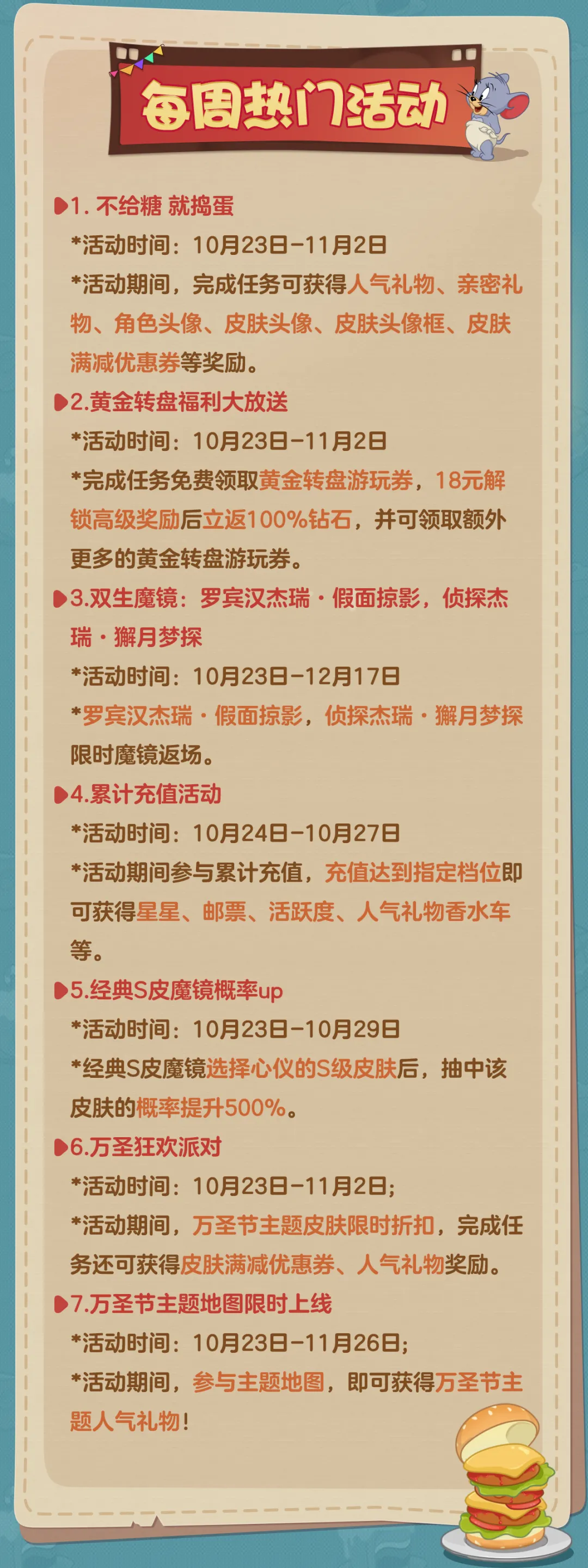 以上就是本周(10月23日)更新维护的全部内容啦!感谢小伙伴们对于《猫和老鼠》手游的支持和喜爱,愿欢乐永远陪伴大家左右!