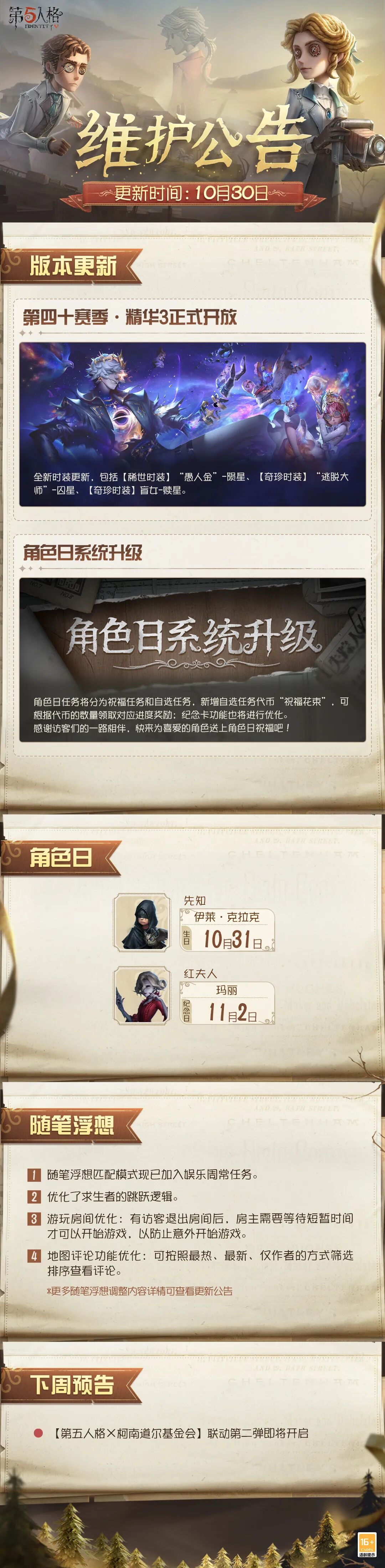为保证庄园的稳定运行,【第五人格】将于周四上午07:30进行不停服维护。