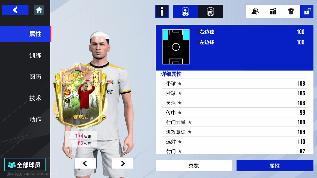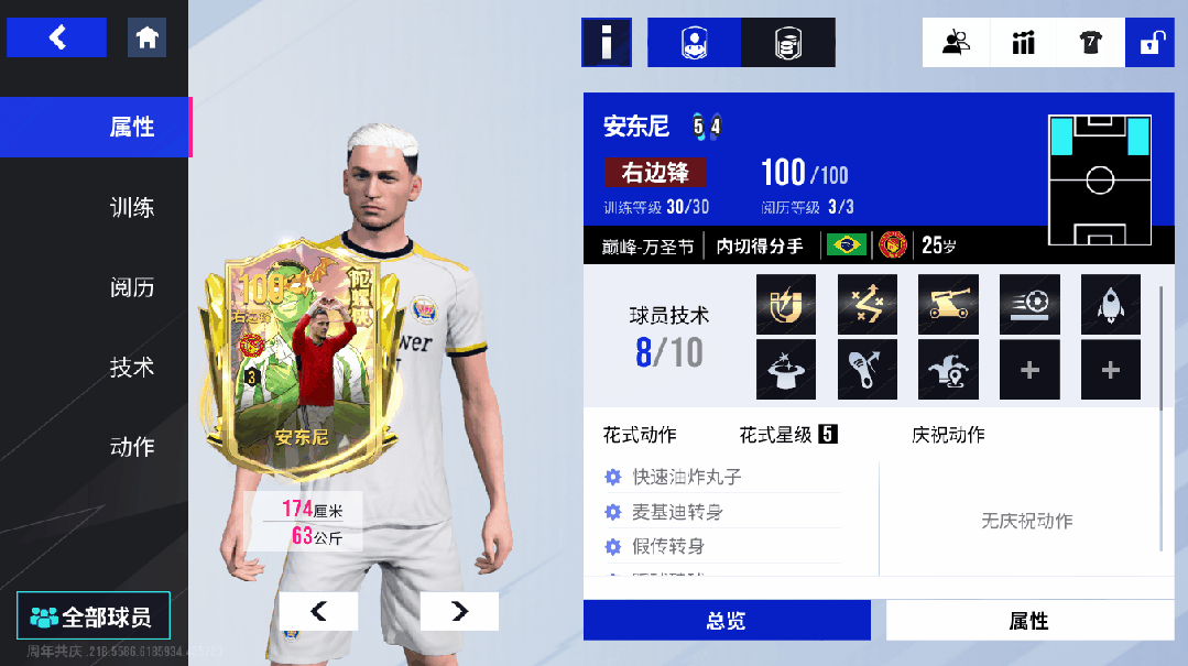作为“桑巴花式爆破手”,这张100潜力值的安东尼在右边锋、左边锋位置将“灵动盘带+暴力远射”的特质拉满!108带球、105控球搭配108灵活,再结合金色【精密带球】【球感】技术,脚下处理充满灵性与攻击性,花式动作下突破防线如入无人之境;金色【重炮】技术加持,110远射、108射门力量让他的远射如“炮弹”般极具威胁,97射门也能在禁区内完成致命一击;99传中让他在边路送出的传中极具威胁,104速度、105加速的机动性令他反击时突击锐利度拉满。从灵动盘带到暴力远射,再到精准传中,堪称“边锋位置的花式、重炮与传中三料能手”,是令对手防线头疼的“内切得分机器”!