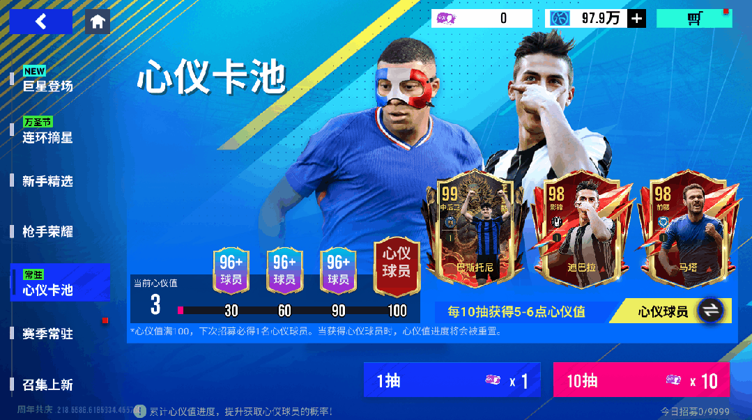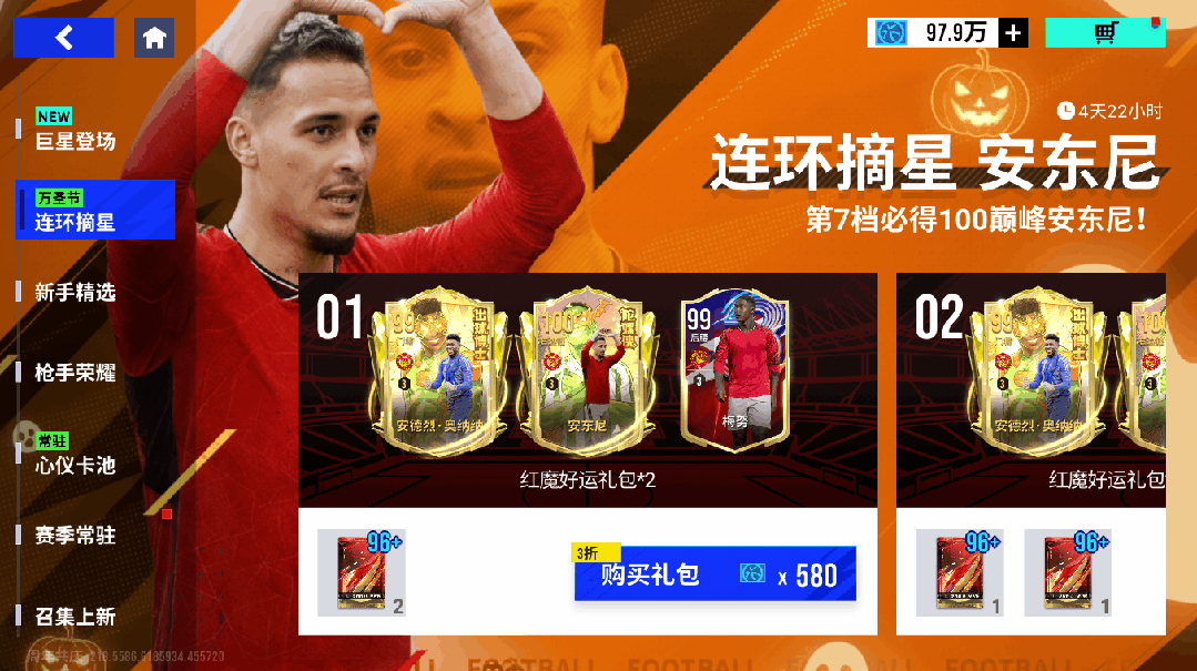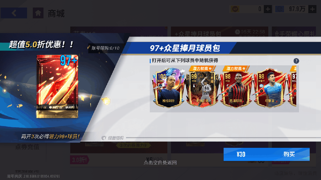 10月31日11时-11月7日11时期间,可在商场购买【97+众星捧月球员包】,打开后可获得97-100巅峰球员,账号限购10次,开启3次必出【98+巅峰】。