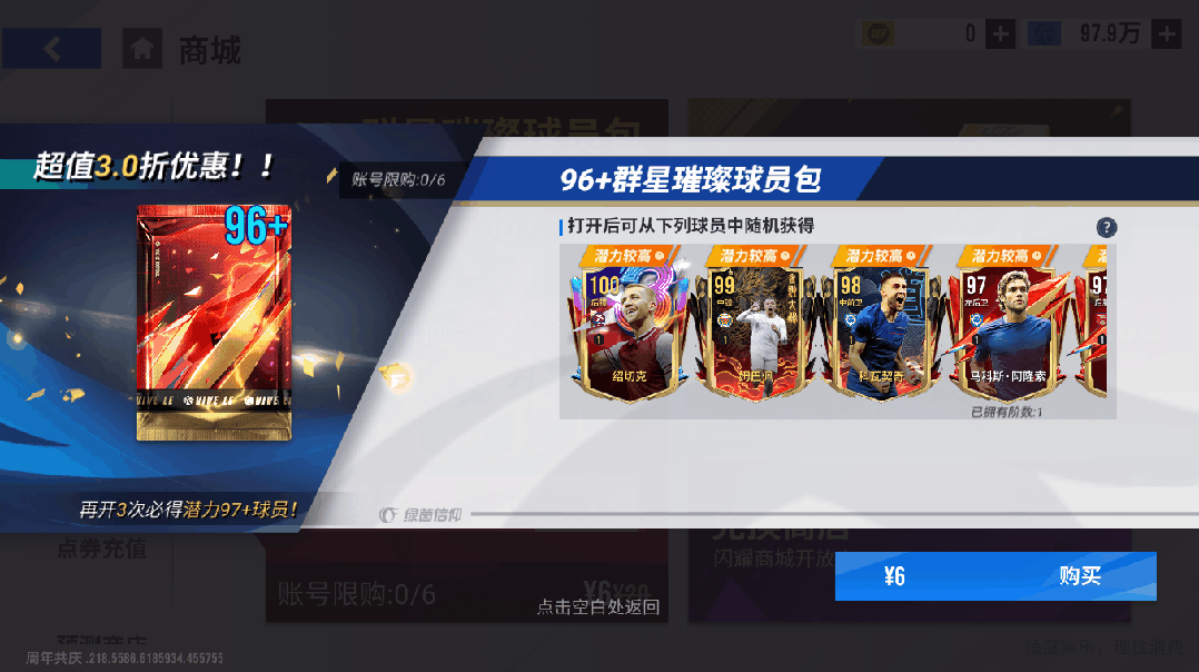 10月31日11时-11月7日11时期间,可在商场购买【96+群星璀璨球员包】,账号限购6次。打开后可获得96-100潜力球员,打开3次必出97+,更有机会获得【100巅峰绍切克】!