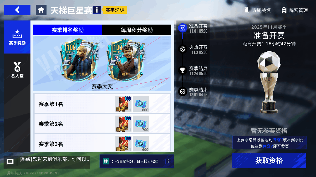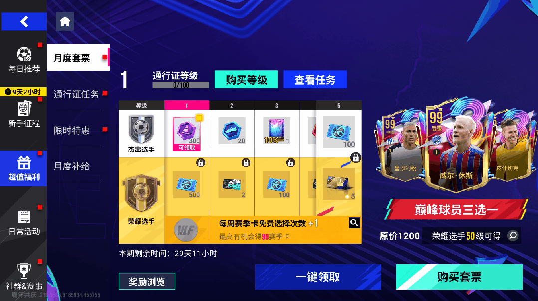 新赛季新奖励,全新套票将于11月1日0时开启,奖励大幅升级,其中包括招募券、球员包等奖励。最终免费大奖可获得98潜力「精选福利自选包」、付费大奖可获得99潜力「巅峰福利自选包」!