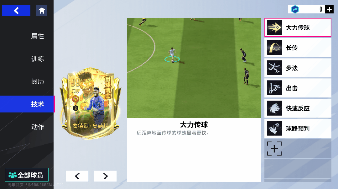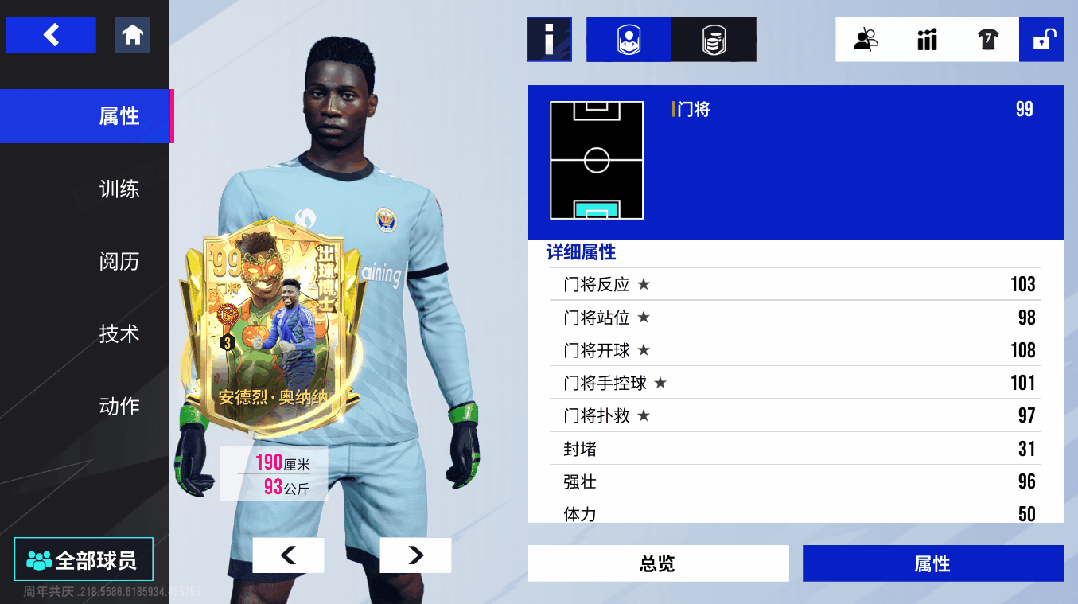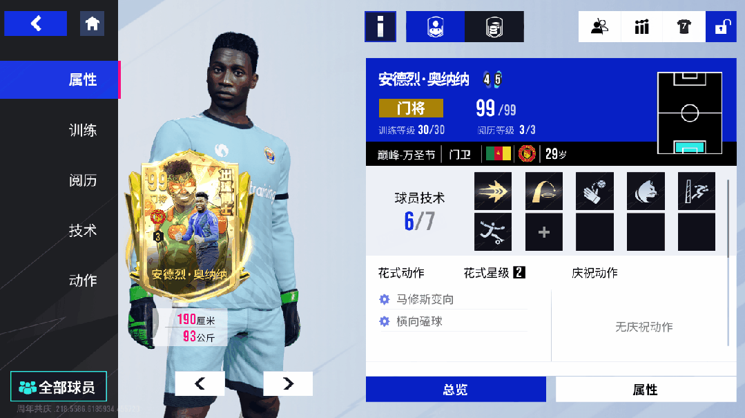 99潜力值的奥纳纳作为“出球型门神标杆”在门将位置兼具扑救与组织能力。103门将反应、98门将站位、97门将扑救让他化身球门的“钢铁壁垒”,门前判断精准、扑救迅捷。在金色【大力传球】【长传】技术加持下,108门将开球、100长传、99短传的精准调度,使他成为球队由守转攻的“进攻发起点”,能瞬间发起攻防转换;101门将手控球确保接球稳定,避免二次失误。从门前神扑到精准长传策动进攻,他凭借出色出球技术,是球队后防与进攻衔接的“关键枢纽”!