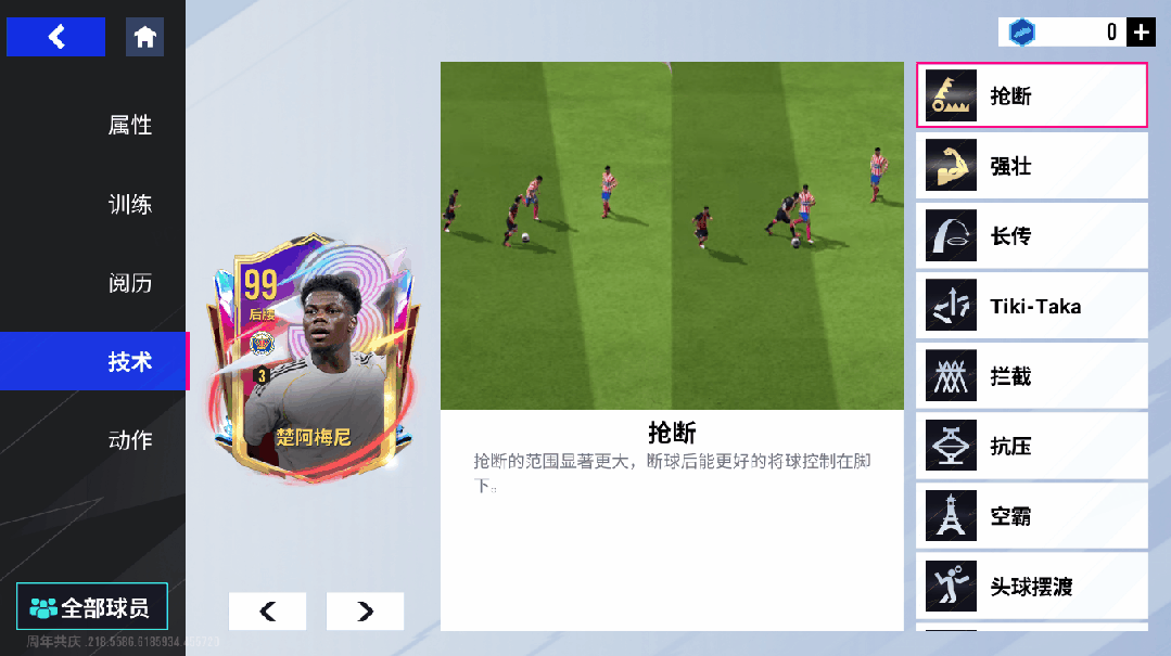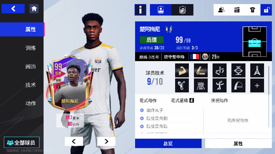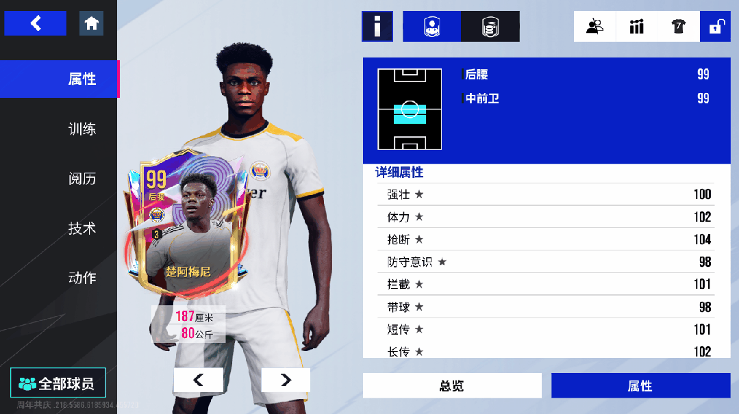99潜力值的楚阿梅尼作为法兰西和白衣军团的铁腰防守屏障拥有100强壮搭配金色【强壮】技术,让他对抗时如“铁塔”般稳占上风,104抢断结合金色【抢断】技术,再加上101拦截、98防守意识,他在中场拦截范围极大,对手进攻推进时常被他强硬断球瞬间瓦解;101短传、102长传的精准调度,使他成为攻防转换的“节拍器”,能高效梳理进攻线路。102射门力量、101远射也让他具备禁区外重炮轰门的威胁,102体力保障全场高强度防守与调度,堪称“防守与组织兼备的中场铁壁”,是球队中场的“全能防守指挥官”!