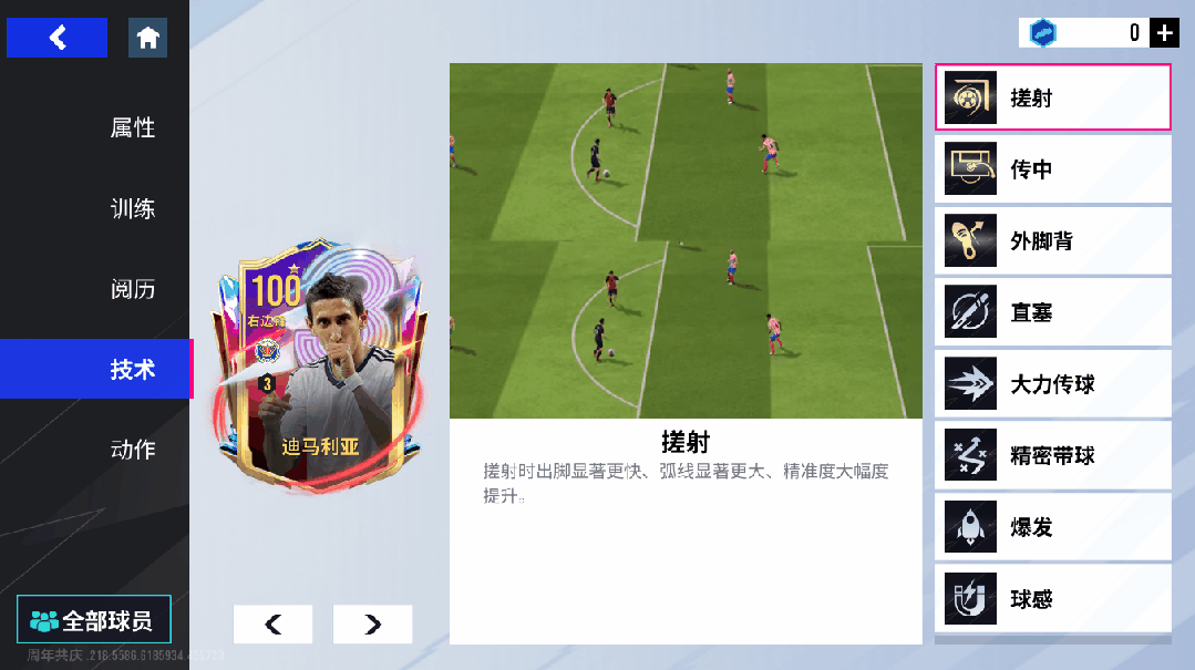 作为能驾驭右边锋、前腰、左边锋、影锋多个核心位置的全能攻击手,这张 100 能力值的迪马利亚将 “灵动突破 + 全域攻坚” 的特质拉满!108速度与108加速的组合,让他在边路奔袭时兼具节奏变化与极致冲击力;搭配【球感】【精密带球】技术,脚下处理充满灵性与攻击性,每一次闪转腾挪都能制造撕裂防线的致命机会。进攻端,104射门、107远射搭配金色【搓射】技术,无论是禁区内的巧射,还是禁区外的搓射和远射都极具威胁,106射门力量更让射门极具穿透力。传球方面,111传中、105短传在金色【传中】【外脚背】技术和【直塞】技术加持下,迪马利亚既能在边路送出手术刀般的精准传中,又能在中场完成细腻的串联组织,103进攻意识让他的跑位充满想象力,让他成为前场令对手无从防范的 “全能进攻精灵”!