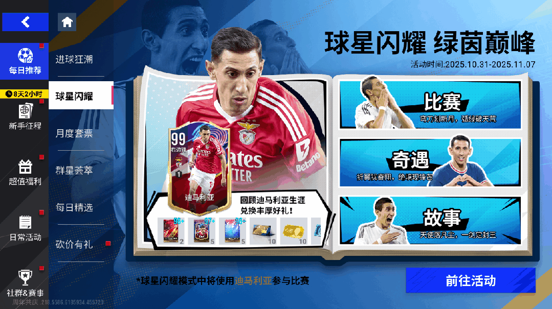 10月31日11时-11月7日11时期间,使用迪马利亚,回顾阿根廷天使的传奇生涯,兑换丰厚好礼!更有99精选迪马利亚等着您!完成任务获得星光币,可在闪耀商城兑换「96+巅峰球员包」「97+银河战舰球员包」「96+潘帕斯球员包」「登场券」「心愿招募券」!