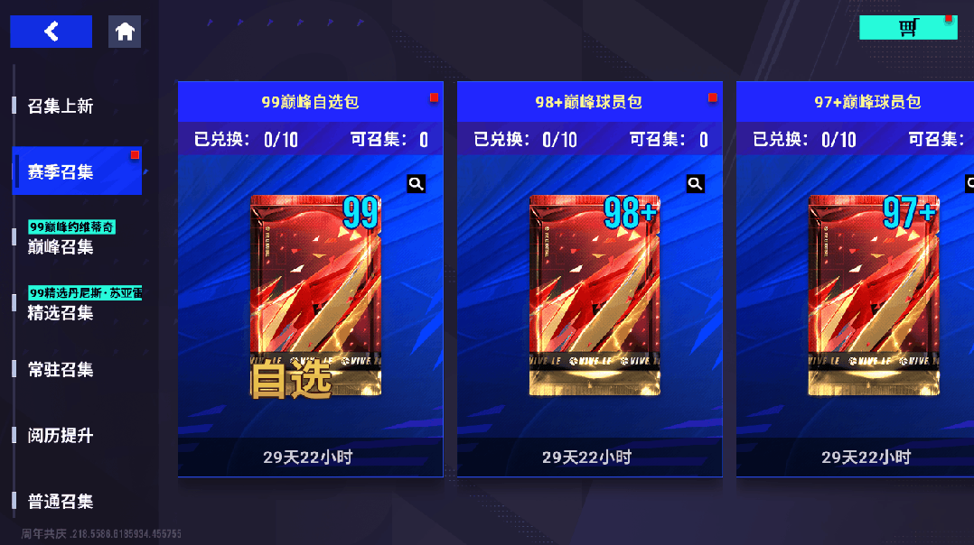 11月1日0时将更换【98+巅峰球员包】、【冠军99巅峰自选包】、【冠军99精选自选包】,更换新的幻金巅峰球员,100巅峰祖马以及100巅峰丹特。