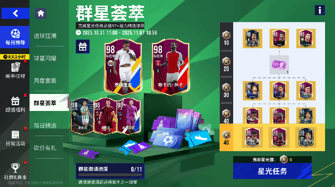 10月31日11时-11月7日11时期间,玩家通过完成星光任务,选择自己的11人阵容,最终必得1名潜力97+强力精选!