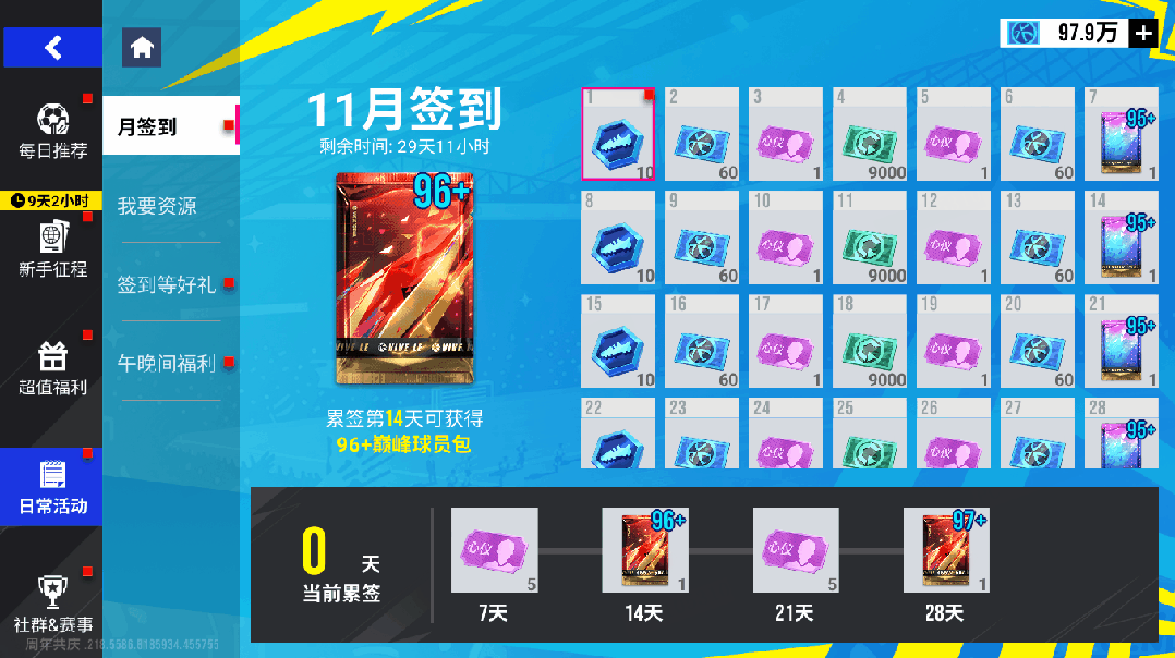 11月1日起,奖励焕新升级,累计签到达指定天数可得【97+巅峰球员包】。
