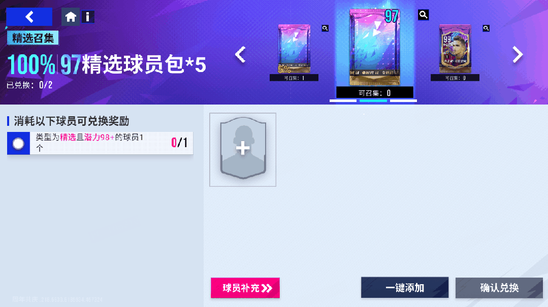 【97精选随机包】阵容召集挑战将于11月4日11时至11月7日11时开启。活动期间每日可进行2次召集挑战,按条件使用1个98精选球员进行召集,可拆分获得5个【97精选随机包】。