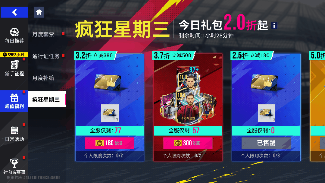 【疯狂星期三】仅在周三12-14时、18-20时与21-23时开启,全服玩家都可参与,活动期间可用超低价购买超值商品,每件商品均有限购数量,售完即止。