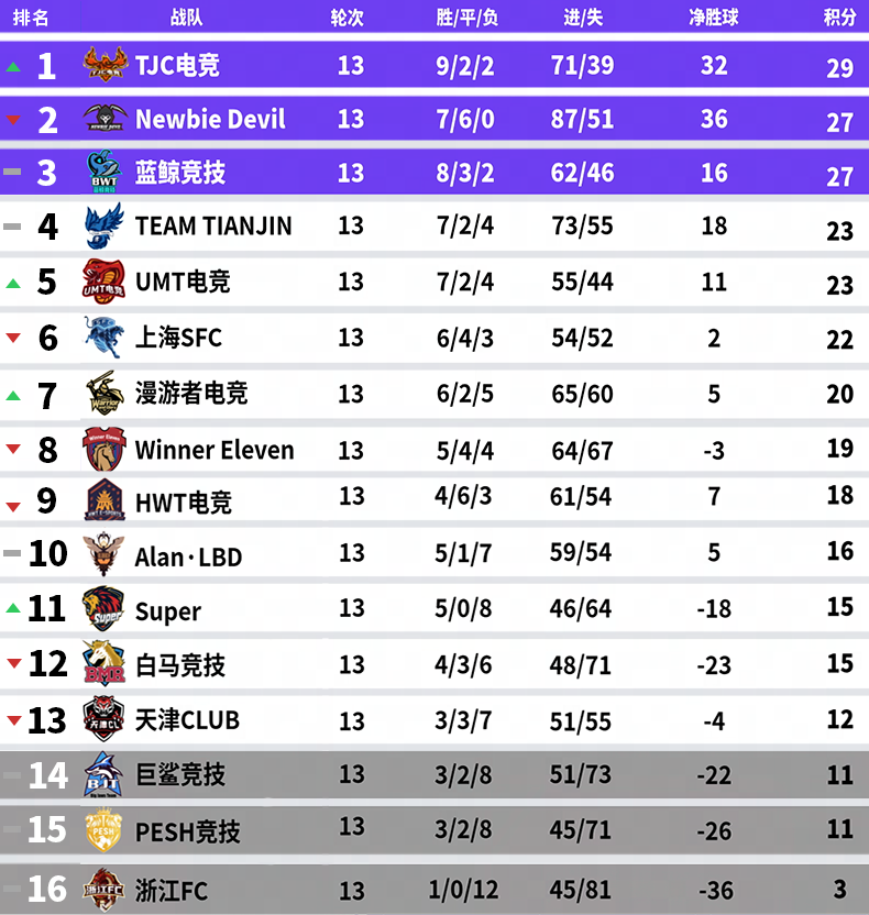 实况足球战队超级联赛25-26赛季夏季赛第十三轮已经战罢,此前胶着的争冠与保级形式在本周开始逐步明朗,TJC在本轮终于抓住了机会,趁着两大竞争对手打平之际一跃反超登顶!而TTJ本轮意外不敌漫游者竞技,上海SFC也被WIN逼平,两支本就在竞争尾列的队伍也彻底退出冲冠梯队。另一方面,浙江FC本轮再度输球,提前两轮宣告降级,这支从S1赛季就在超级联赛征战,缔造一时王朝的老牌豪门,还是迎来了落幕之时。