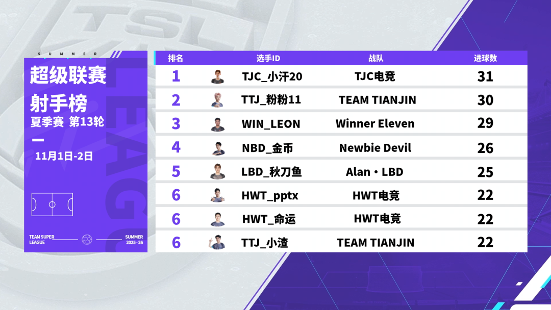 随着TJC_710在第三局再度3:0拿下BMR_c学长,TJC成功在本轮完成横扫,拿下比赛后以2分优势领跑积分榜!而本周打入四球的TJC_小汗20不仅凭借优秀表现斩获周MVP,更是以31球反超粉粉11,领跑射手榜!
