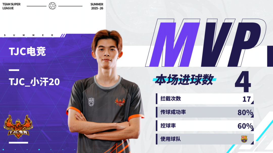 NBD与蓝鲸竞技战平,TJC又一次迎来了最佳的登顶机会,此前两度有机会趁着NBD平局反超却未能抓住机会的他们,本轮终于没有让机会溜走!面对近况平平,还在为保级抢分的白马竞技,TJC众将本轮齐齐发威,TJC_Kristy传中造乌龙先下一城,TJC_小汗20在赛点局更是没有给BMR_魔力红任何机会,无论是暴力的远射发难,还是禁区内闲庭信步的细腻微操,小汗20把比赛变成了自己的秀场,4:0毫不费力拿下对手,锁定胜利!