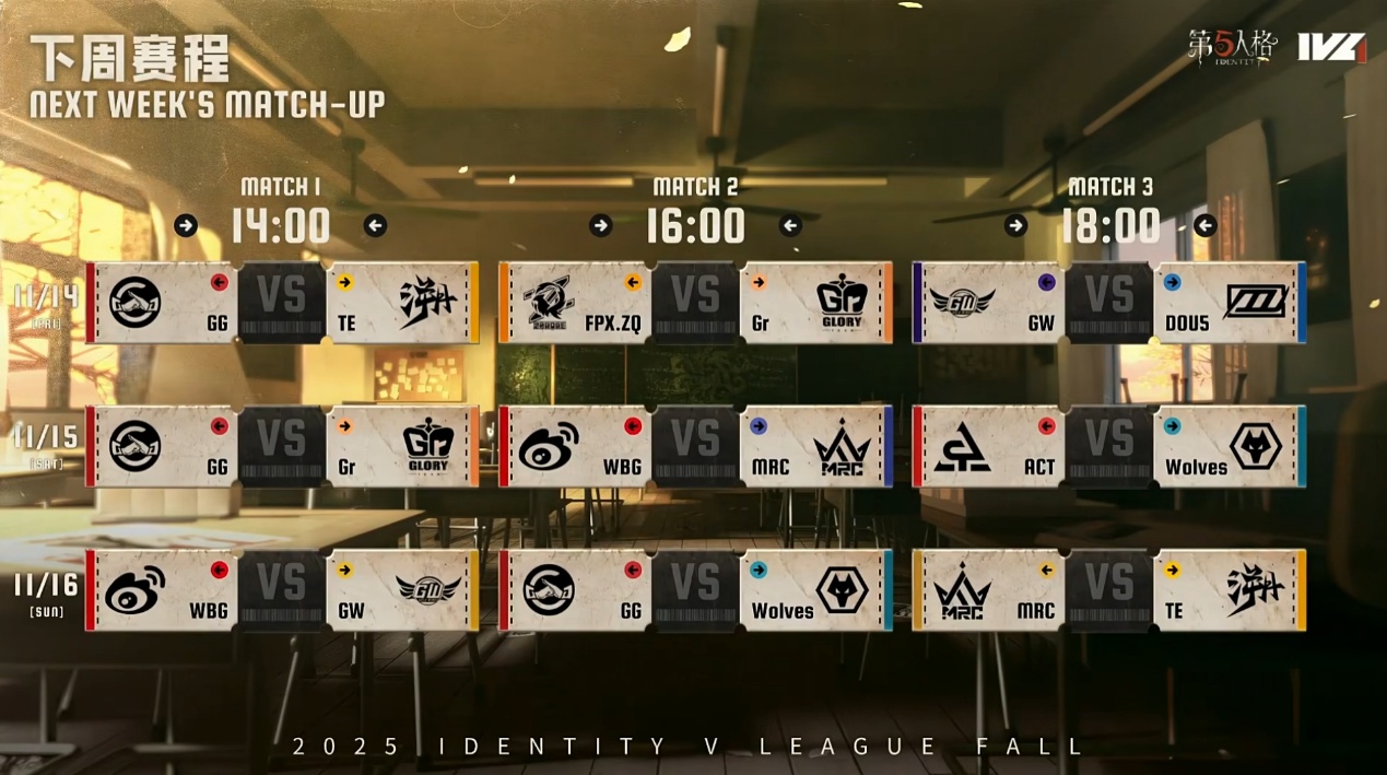 下周成都GG战队即将面对稳坐积分榜首、以战术严谨著称的MRC战队,无坚不摧、总能强势破敌的“常胜之师”Gr战队,以及旗鼓相当、蓄势待发的成都Wolves战队,三场并不轻松的战斗,他们能否撕开裂缝,打出精彩操作,窥探胜利曙光?强敌环伺,鹿死谁手,敬请期待10月17日14:00第五人格赛事直播间,我们不见不散!