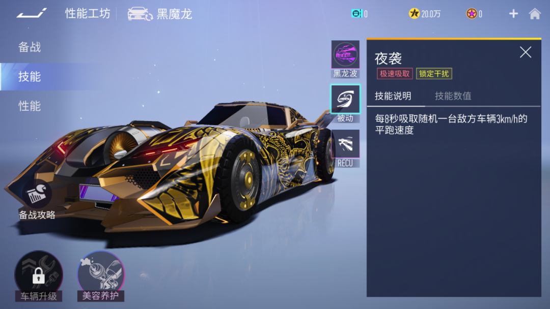 每8秒吸取随机一台敌方车辆3km/h的平跑速度。