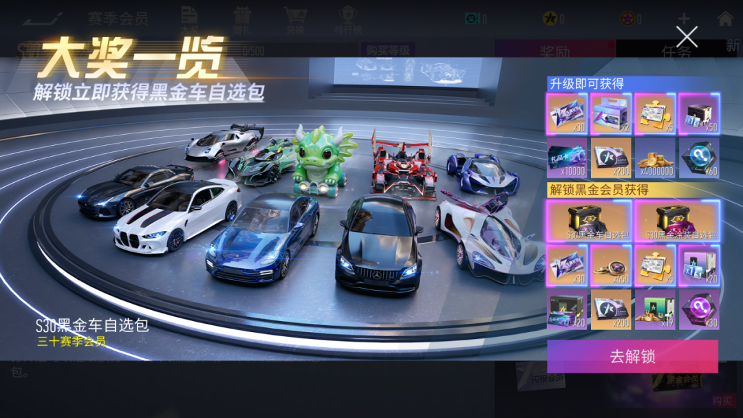 黑金会员车手升级赛季会员等级可以额外领取王牌补给券、传说蓝图碎片、纪念币等多种资源奖励!