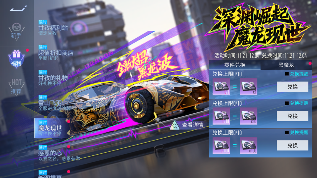 深渊崛起,魔龙现世!11月21日~12月4日,完成『黑魔龙』专属任务可获得黑龙波 零件。同时,活动期间还可以免费将漆黑魅影 零件转换为黑龙波 零件,方便赛车手们快速升级赛车!