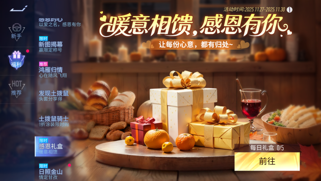跑图即可掉落!11月27日~11月30日,对局胜利即可掉落感恩礼盒,有机会开出王牌补给券~