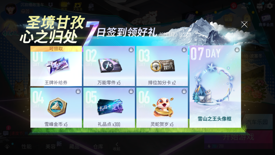圣境甘孜,心之归处。11月21日~11月27日 登录速度节即可领取好礼,第七天还可以领取:雪山之王头像框。赛车手们不要错过圣境的馈赠呦~