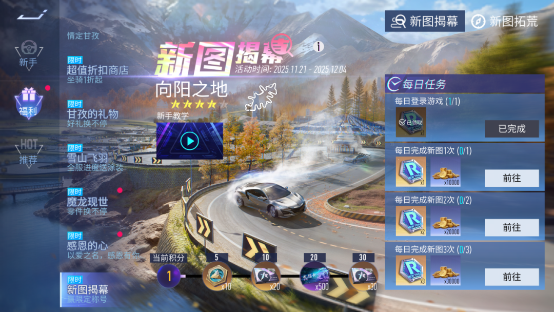 4星山地赛道『向阳之地』、『向阳之地逆向』将在11月21日0点加入速度节赛场。车手们可以在练习赛以及房间模式中体验到全新赛道,排位赛会在后续开放。