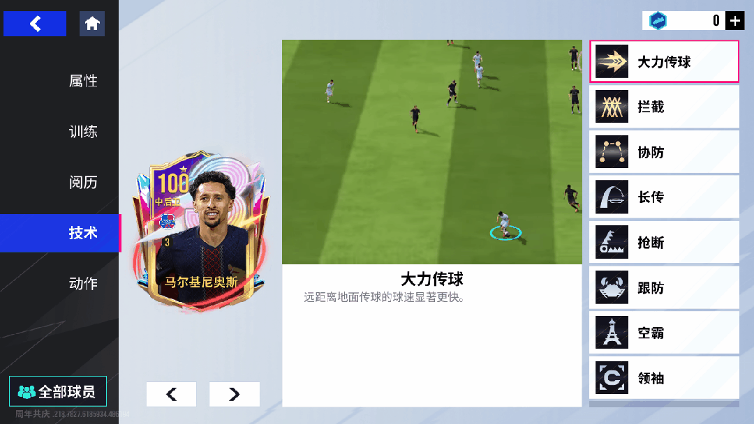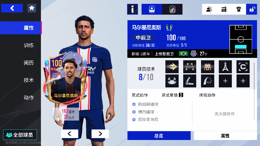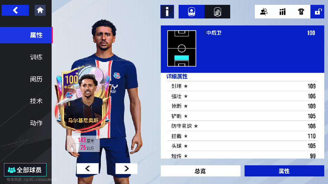 在绿茵信仰的赛场上,我们亦能觅得马尔基尼奥斯巅峰的铁血真容!这张 100 潜力巅峰马尔基尼奥斯,将这位巴西后防统帅的统治力完美复刻!本就以铁血防守与精准出球见长的他,有着恐怖的110 拦截和109 抢断能力,还自带金色【拦截】技术与【抢断】【跟防】技术,简直是后防的钢铁长城,用极致防守牢牢锁死对手的进攻命脉!除了铜墙铁壁的防守,出球策动的马尔基尼奥斯同样出色,100 长传搭配金色【大力传球】技术,远距离地面传球球速显著更快,宛如后防的 “进攻发报机”,用精准调度盘活球队由守转攻的节奏!身体对抗与回追能力更是他的撒手锏,103 速度、106 强壮辅以【空霸】技术,让这位后防悍将既能凭借速度回追掐灭边路威胁,又能以强悍对抗在争顶中稳压对手,再以105 头球在高空战场筑起绝对统治!作为防线的 “精神领袖”,他的金色【协防】技术提升团队防守协同性,106 防守意识让他成为后防 “大脑”,预判补位、指挥防线尽在掌控。从铁血拦截到精准出球,他堪称 “后防位置的攻防双料旗手”,仅凭一己之力就能铸就球队防线的 “不败堡垒”!