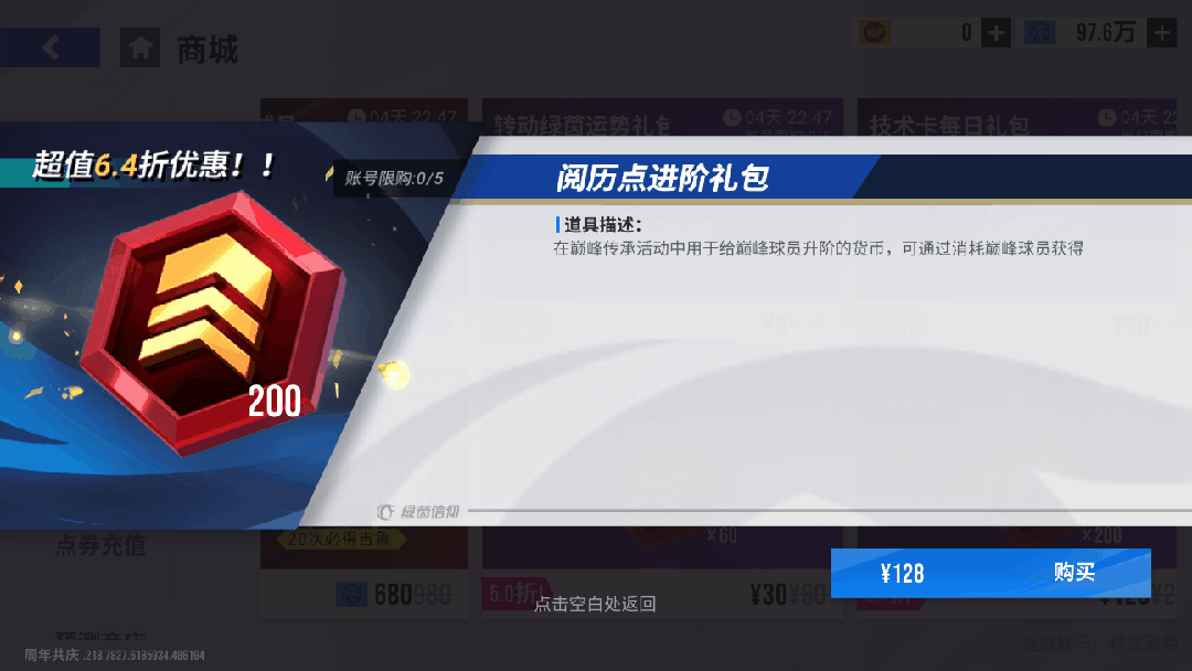 11月21日11时-11月28日11时期间,可在商场购买【阅历点进阶礼包】,账号限购5次,购买可获得阅历点*200,仅需128元!