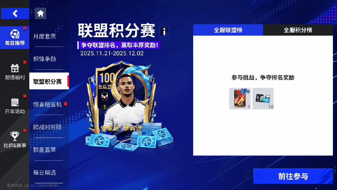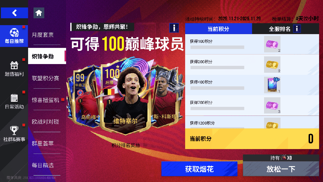 11月21日11时-11月28日11时期间,玩家参与活动任务可获得烟花,使用烟花可获得随机活动积分,累计积分可获得丰厚奖励,并参与活动排名,最高可获得包括维特塞尔、道格拉斯·科斯塔100巅峰球员奖励!