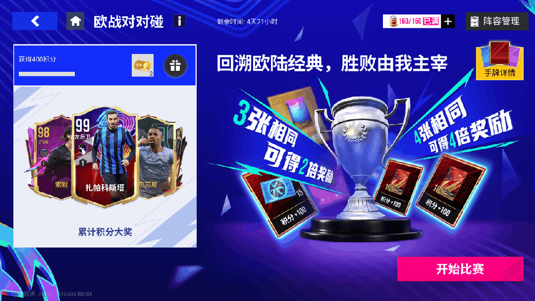 11月21日11时-11月28日11时开启,重回当年的欧洲决战,书写属于自己的结局。完成比赛任务可以获得选牌机会,选择你想要的奖励。