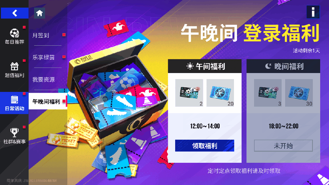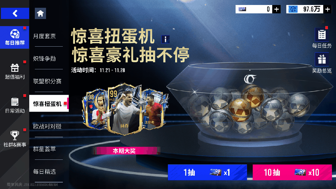 11月21日11时-11月28日11时期间,玩家每日完成任务,都将获得一定数量的金球奖券用以抽取奖励,最高奖励为【98+巅峰球员包】。