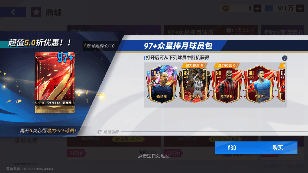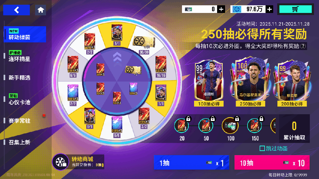 11月21日11时-11月28日11时期间,可在商场购买【97+众星捧月球员包】,打开后可获得97-100巅峰球员,账号限购10次,开启3次必出【98+巅峰】。