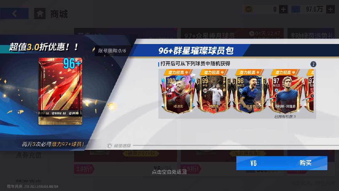 11月21日11时-11月28日11时期间,可在商场购买【96+群星璀璨球员包】,账号限购6次。打开后可获得96-100潜力球员,打开3次必出97+,更有机会获得【100巅峰绍切克】!