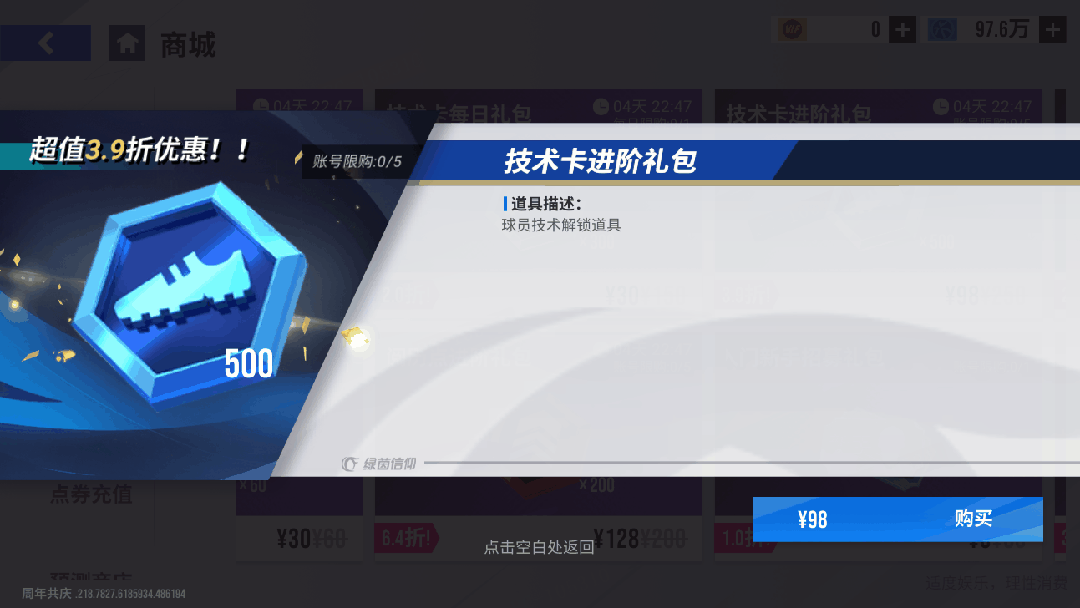 11月21日11时-11月28日11时期间,可在商场购买【技术卡进阶礼包】,账号限购5次,购买可获得技术卡*500,仅需98元!