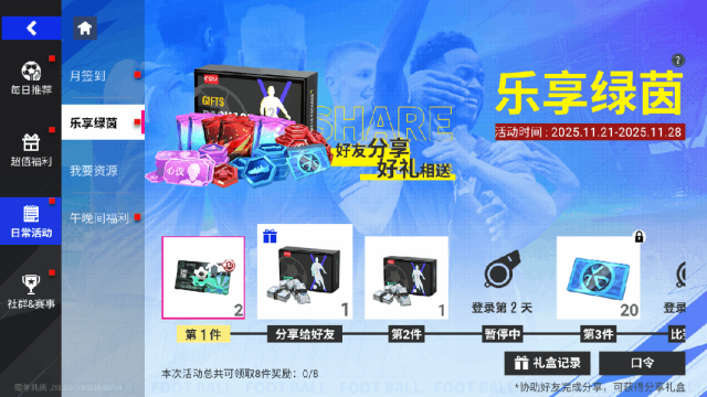 11月21日11时-11月28日11时期间,玩家签到分享领好礼、分享也可获得「分享礼盒」奖励!