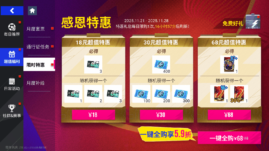 11月21日11时-11月28日11时期间,【感恩特惠】惊喜上线!每日登录可以以优惠的价格购买「97+巅峰球星包」「转盘抽奖券」等特惠商品,一次性打包购买更可享超值折扣!