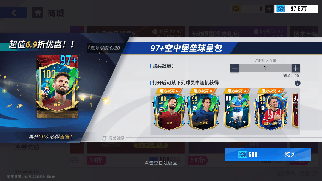 11月21日11时-11月28日11时期间,可在商场购买【97+空中堡垒球员包】,打开后可获得97-100巅峰或精选球员,仅需680蓝券,账号限购20次,开启20次必出【100巅峰吉鲁】。
