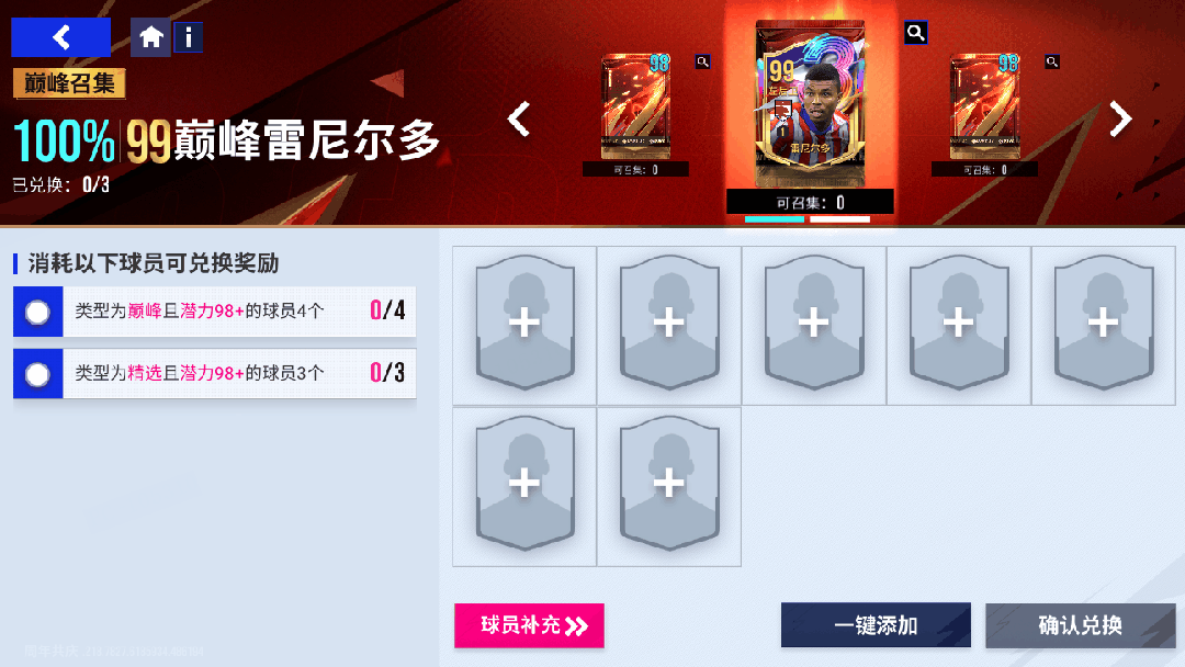 【99巅峰雷尼尔多】阵容召集挑战将于11月21日11时至12月5日11时开启,活动期间累计可进行3次召集挑战,按条件使用指定球员进行召集必得【99巅峰雷尼尔多】。