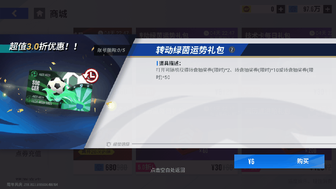 11月21日11时-11月28日11时期间,可在商场购买【转动绿茵运势礼包】,账号限购5次,打开后可获得转盘抽奖券(限时)!
