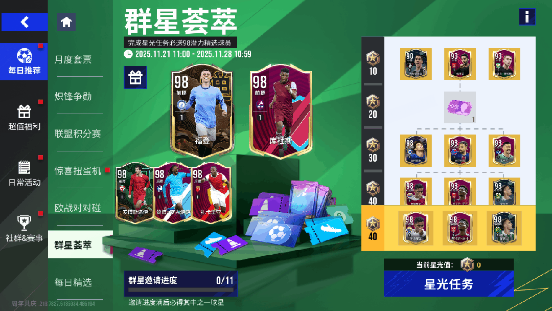 11月21日11时-11月28日11时期间,玩家通过完成星光任务,选择自己的11人阵容,最终必得1名潜力98强力精选!