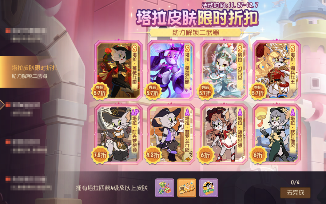 活动期间,蔷薇女爵、星海幻影、刀马旦、锡兵女王、紫罗兰女郎皮肤彩饰、时光梦想师皮肤彩饰、胡桃异想皮肤彩饰、秋月晚风皮肤彩饰限时折扣,完成任务还可获得皮肤满减优惠券、塔拉人气礼物、塔拉专属成就积分奖励。