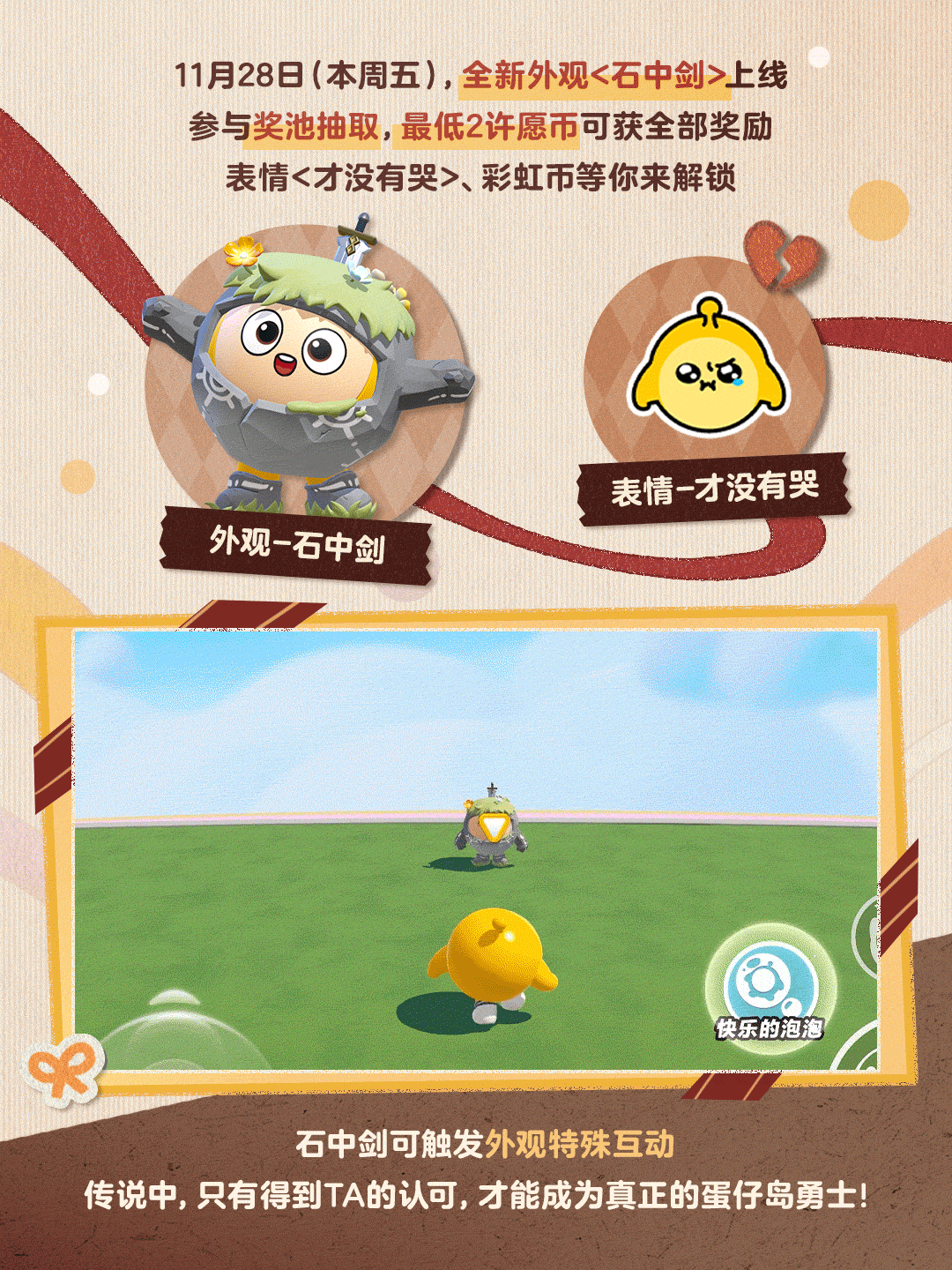 11月28日(周五)全新外观-石中剑登场!外观特殊互动解锁,速来测试你是否为TA认定的天选之蛋~