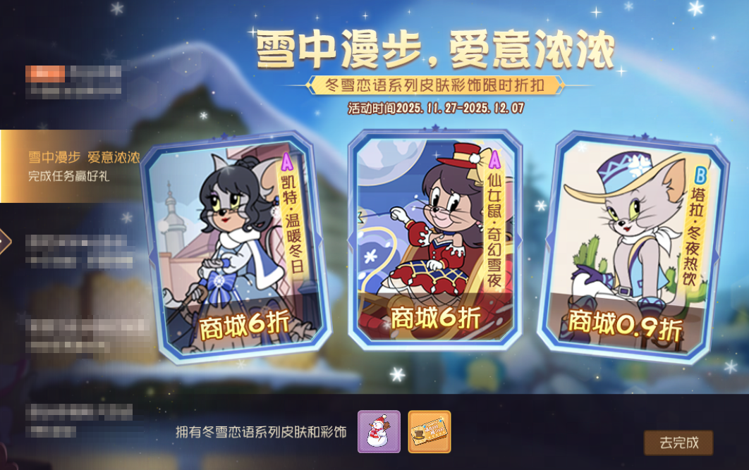 活动期间,冬雪恋语系列的凯特·温暖冬日皮肤彩饰、仙女鼠·奇幻雪夜皮肤彩饰、塔拉·冬夜热饮上架商城并限时折扣。