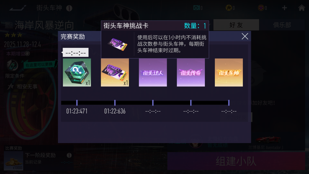 同时,11月28日起,街头车神将新增挑战卡,使用挑战卡后1小时内可以不消耗每日次数参与街头车神玩法。