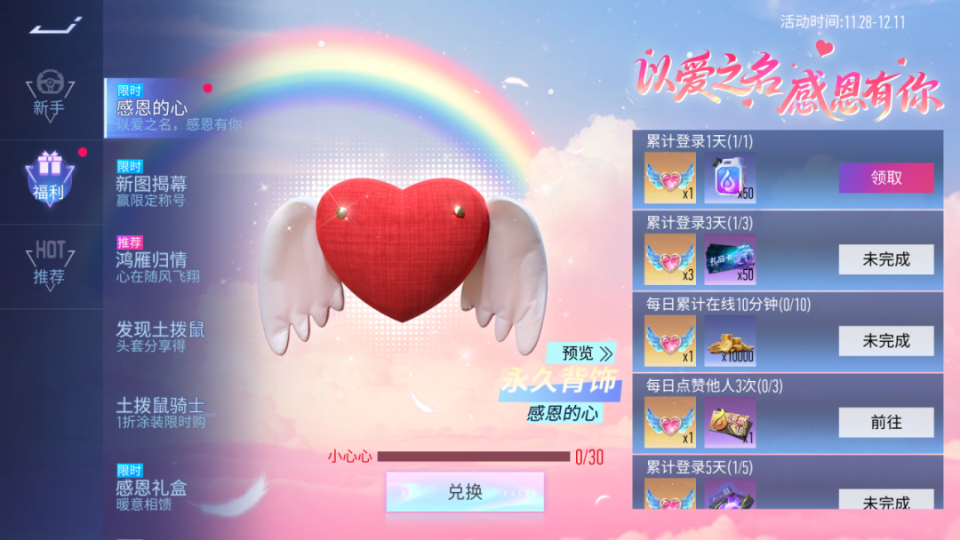 以爱之名,感恩有你~11月28日~12月11日,完成任务积攒小心心道具,达到一定数量即可免费兑换永久背饰感恩的心。