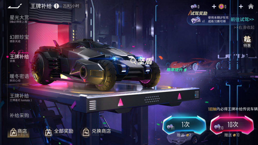 11月21日~12月4日,王牌补给将开启返场活动!传说车辆『兰博基尼 Aventador J』限时概率提升66%!