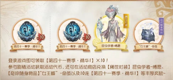 Ps:登录游戏即可领取【第四十一赛季·精华1】×10,另外,访客们可通过参与剧情探索和活动玩法来完成活动任务获取活动代币-“记录”,用于在活动商店兑换【稀世时装】昆虫学者-缚愿、赛季精华×10、【奇珍随身物品】“女王蜂”-命茧等丰厚奖励!千万别错过这波20连抽!